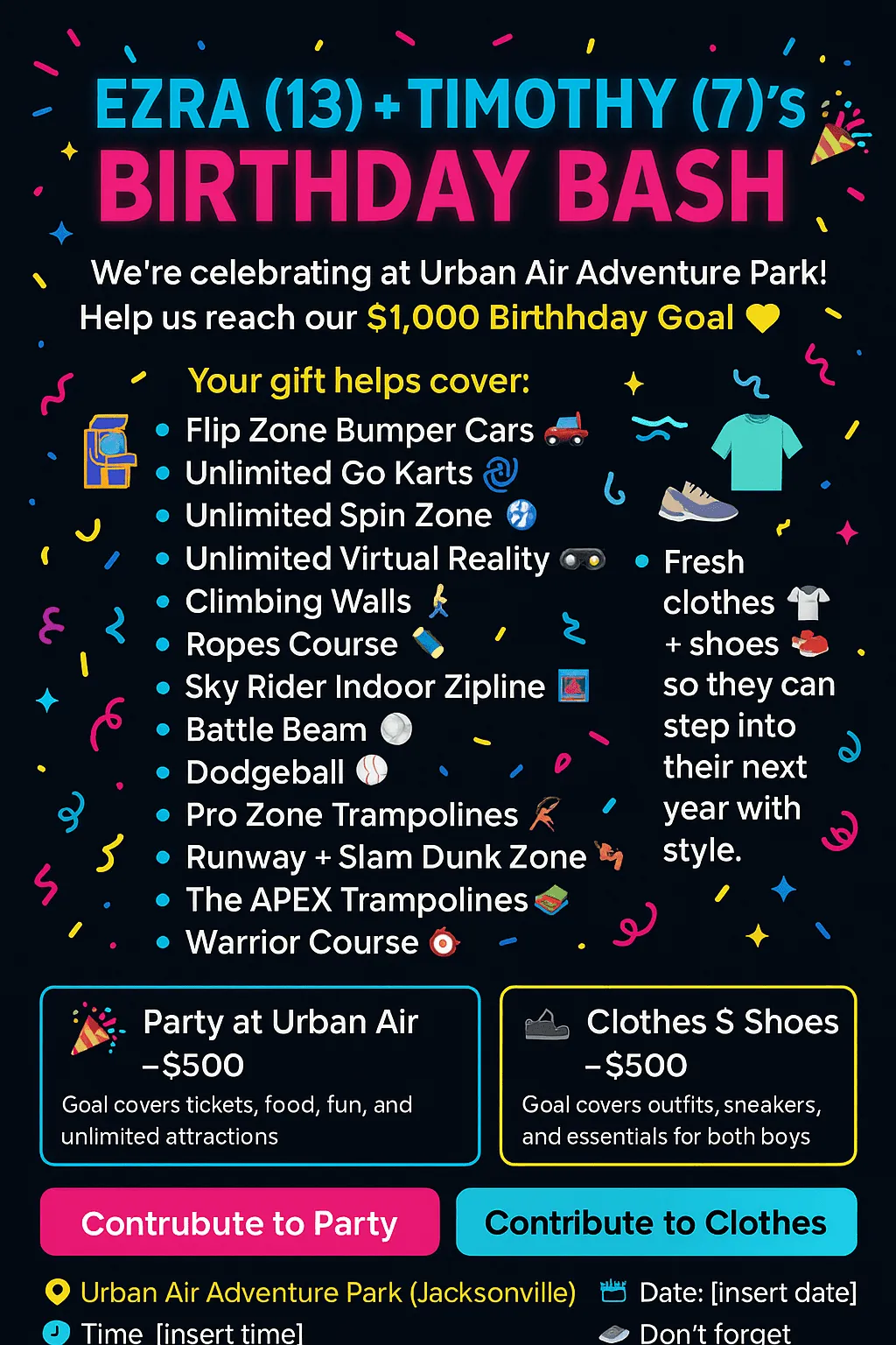 Celebrating Ezra’s 13th & Timothy’s 7th! 🎉 I’m covering what I can, but would love help with their Urban Air adventure + essentials. Forever grateful for any gift 💜